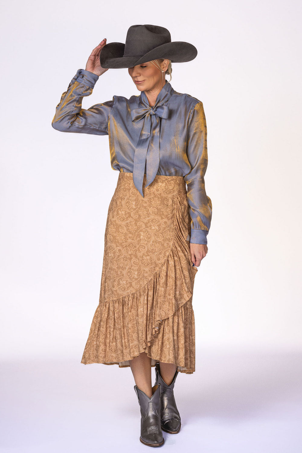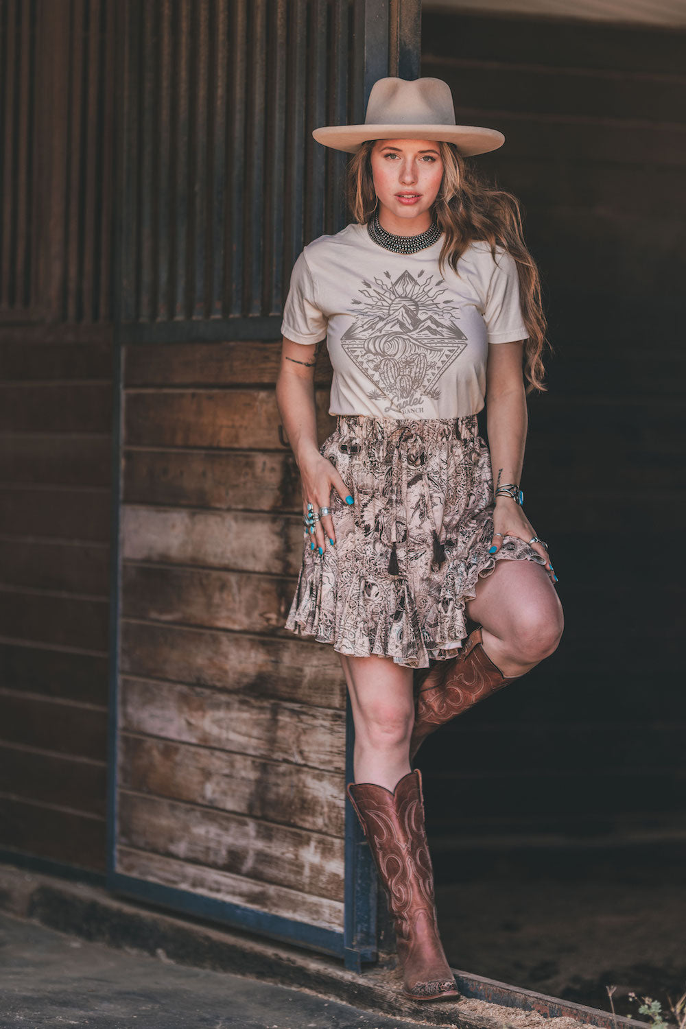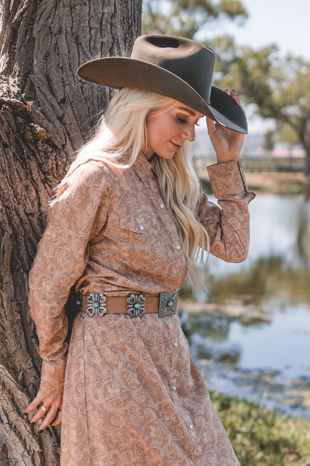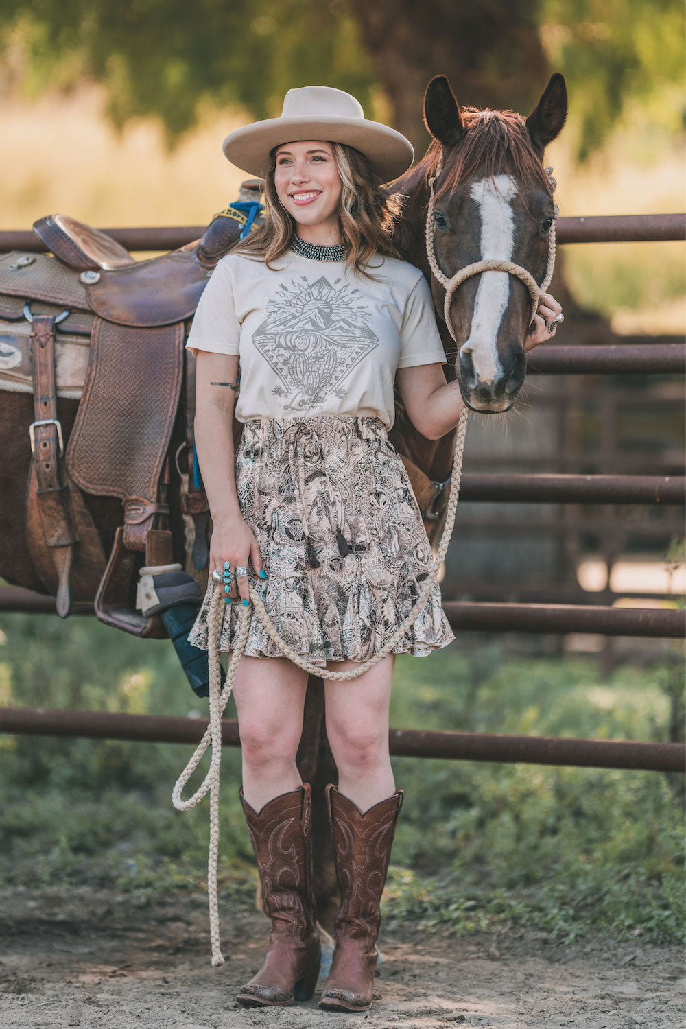I absolutely adore the Lovlei Ranch pearl snap and skirt combo in the Desert pattern! Together it looks like a gorgeous dress, but you can easily mix and match the pieces for endless outfit options. The fabric is dreamy—so soft and luxurious—and the way it moves is pure elegance. I received so many compliments wearing this set! You can dress it up with boots and jewelry or keep it casual for everyday wear. Truly one of my favorite sets!