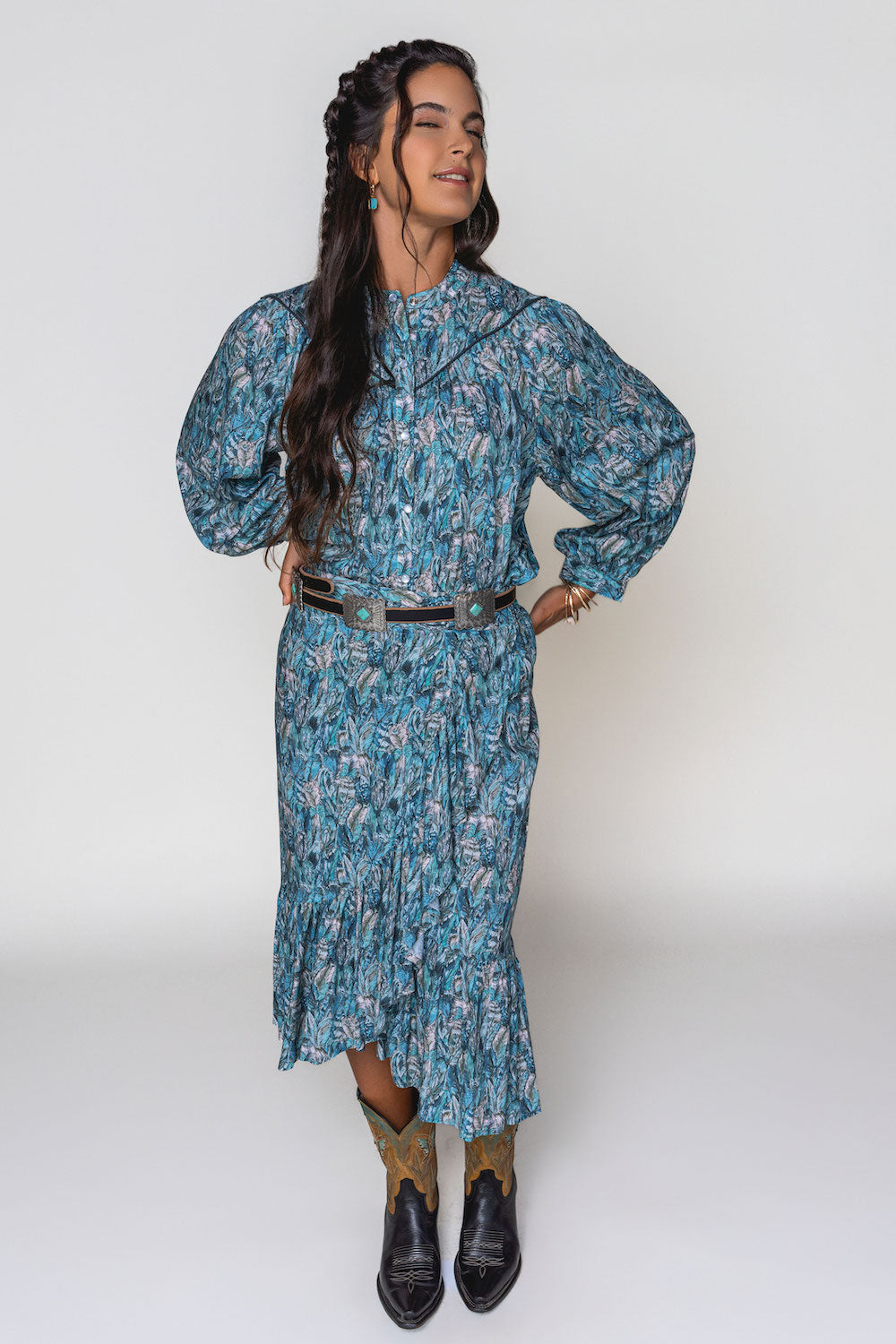 A modern take on classic cowgirl charm, this faux wrap skirt flatters every figure with a soft ruffle that flows from hip to hem. Designed with a fixed front and elastic back, it blends comfort and effortless style in bold, one-of-a-kind prints. 100% rayon. SKU# 24SK1703