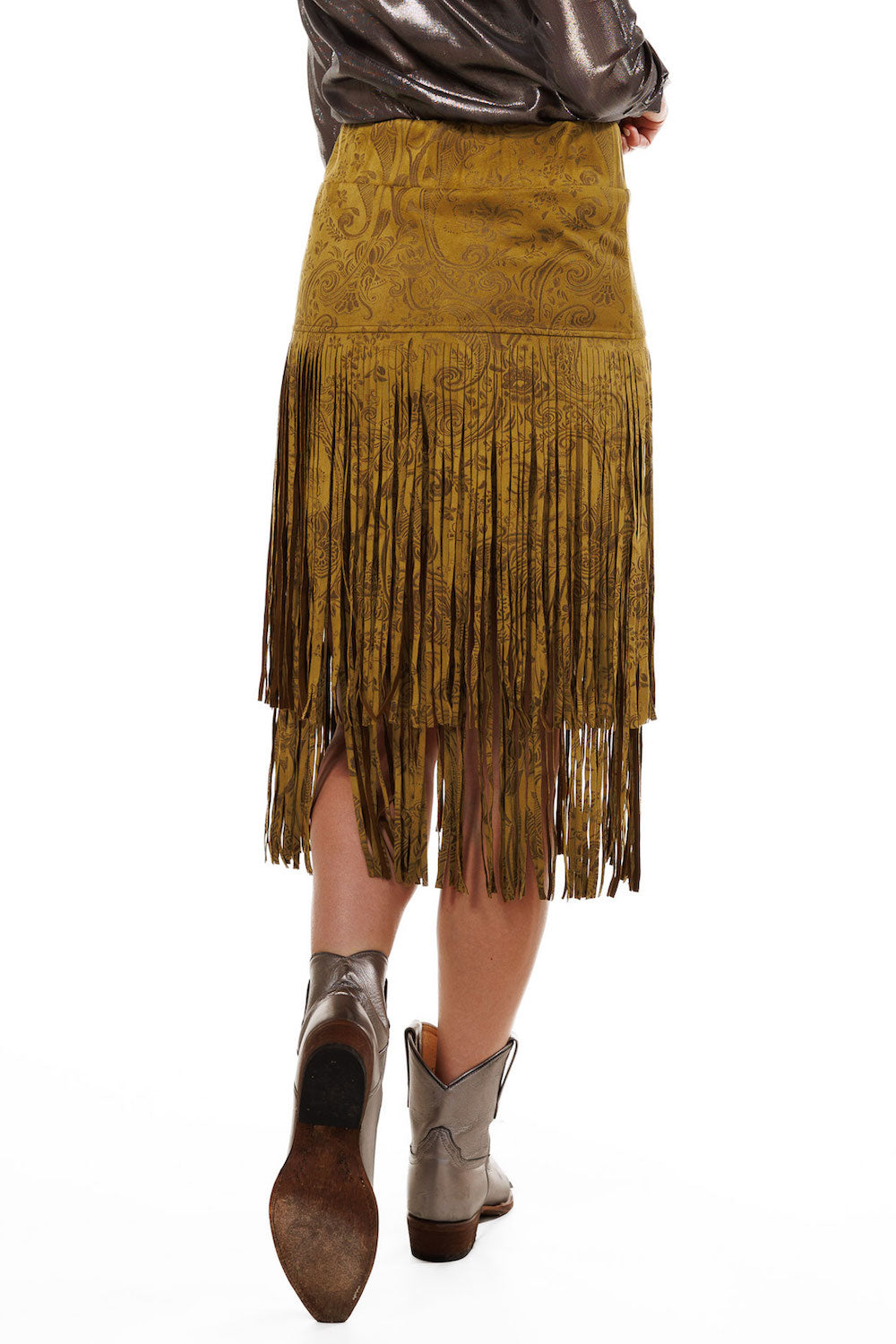 "This fun and flirty skirt features three tiers of fringe, making it a bold statement piece. Crafted from luxurious embossed suede in a stunning Sagebrush colorway, It’s perfect for adding a unique touch to your wardrobe. Pair it with the Trailblazer jacket or style it your way for an effortlessly chic look! I love the flair of fringe added to an outfit and I hope you do too!"
