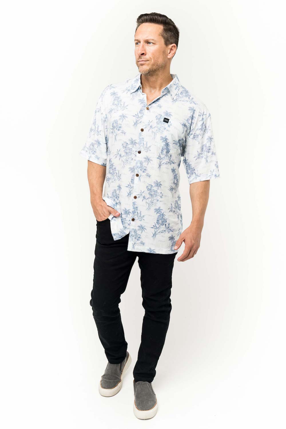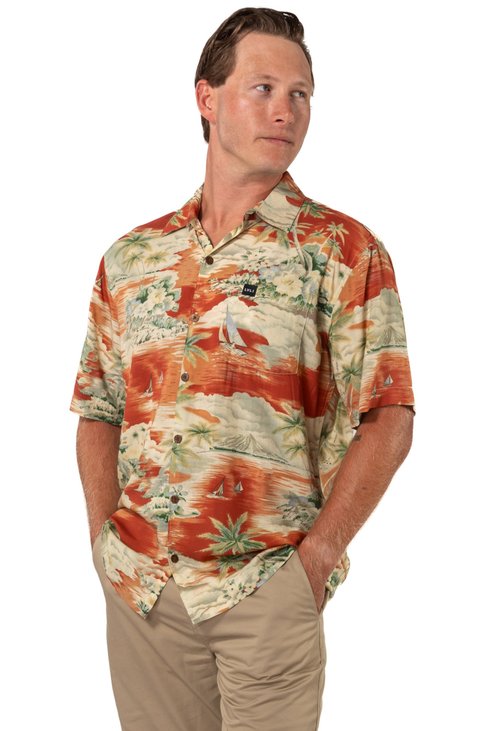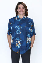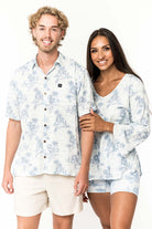 This men's slim-cut Hawaiian-style shirt will keep you cool and comfortable throughout the day and evening. The coconut buttons and slight slit on the side hems elevate the balance of function and style. Plus, you can match your lady with our ‘his and her’ prints! 100% Rayon Poplin for a smooth feel every man will love. SKU# 22MS1001.