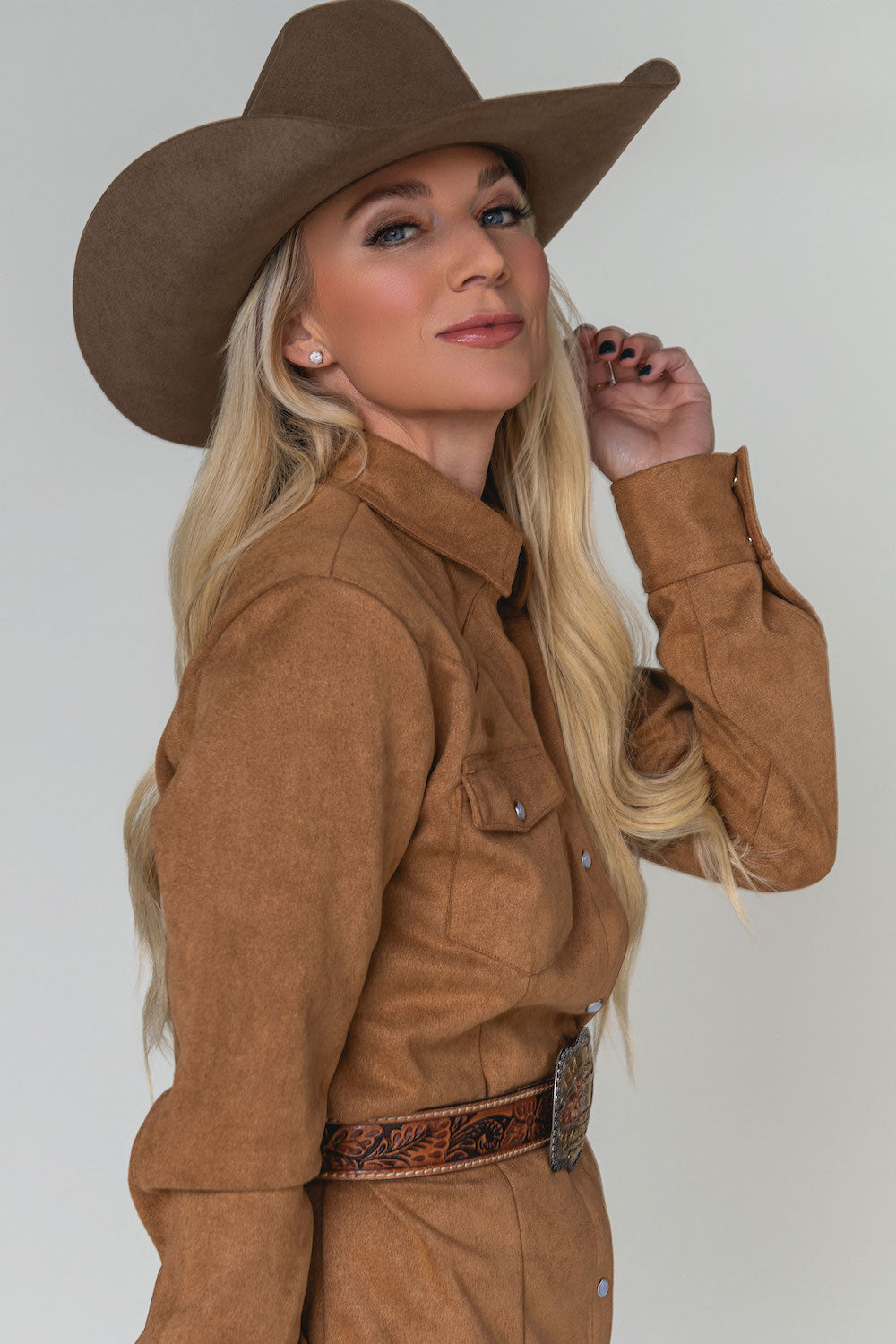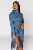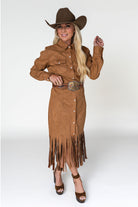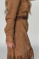 This flattering dress /duster in Ultra Suede has pearl snap button front. Long Fringe hem line to show off your boots. The yokes have a graceful embroidered stitching to give it that extra touch of class. SKU# 25D372.