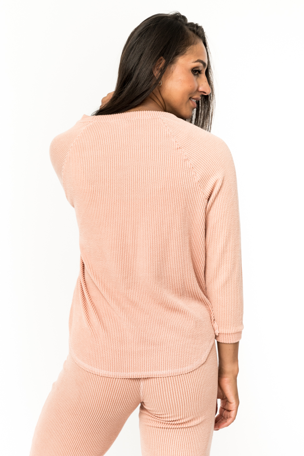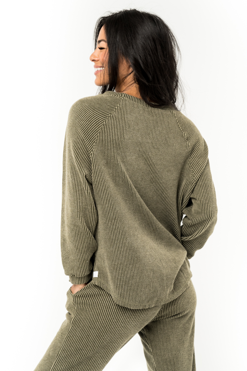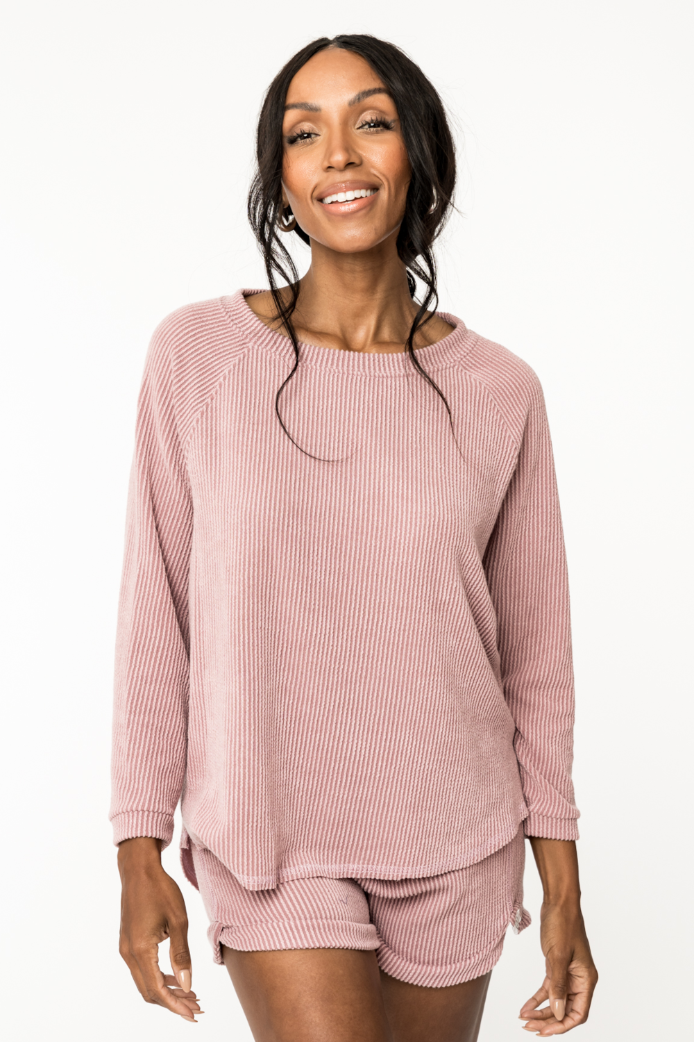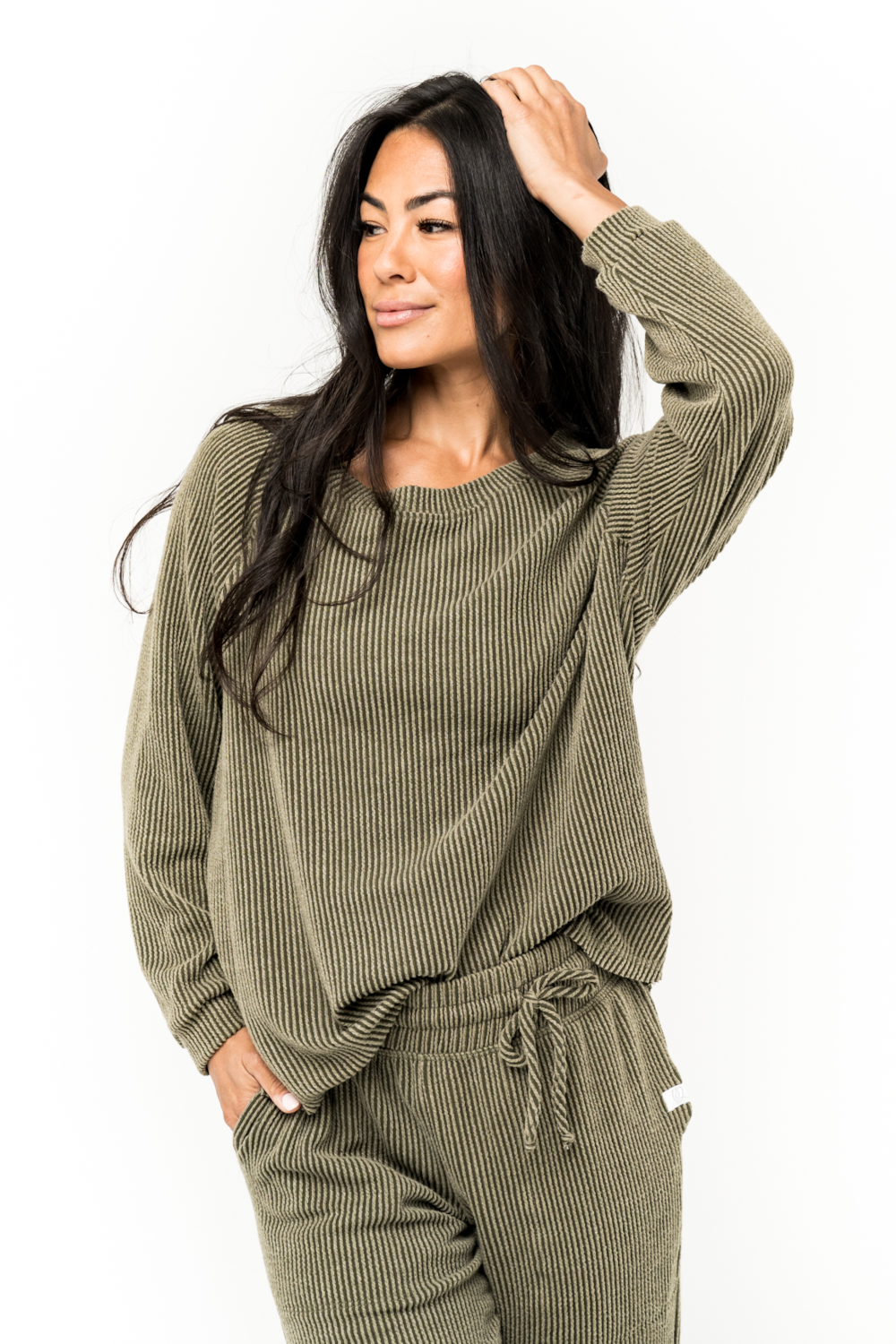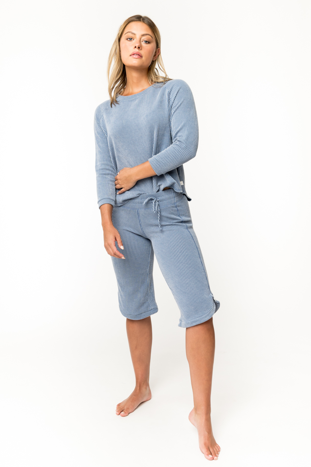 This go-to "Cape Cod" crew neck pullover is great for chilly mornings, or evenings. It's the perfect weight for a sweatshirt (not too light & not too heavy) and is made out of our trending "Urban Love" ribbed fabric. There's a bit of a flare with the longer hem line in the back, while being a bit shorter in the front. This is a great piece to pair-up with our "HB Short" or "Pismo Capri "for a really cute set. You can also mix it up with our activewear! Polyester/Rayon/Spandex blend. SKU# 22T210.
