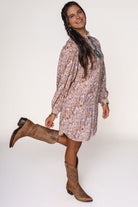 Meet your new showstopper — a flirty above-the-knee pearl snap dress with dramatic balloon sleeves and effortless western charm. A flattering silhouette that is effortless to wear and impossible to forget. SKU# 25D371.