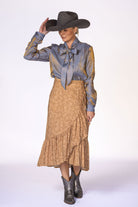 A modern take on classic cowgirl charm, this faux wrap skirt flatters every figure with a soft ruffle that flows from hip to hem. Designed with a fixed front and elastic back, it blends comfort and effortless style in bold, one-of-a-kind prints. 100% rayon. SKU# 24SK1703